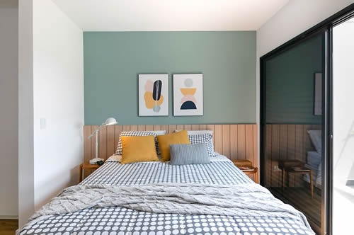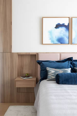 Neste dormitório, o painel de madeira junto com a cabeceira estofada abraça os moradores para boas noites de sono | Projeto Rawi Arquitetura + Design | Foto: Alexandre Disaro