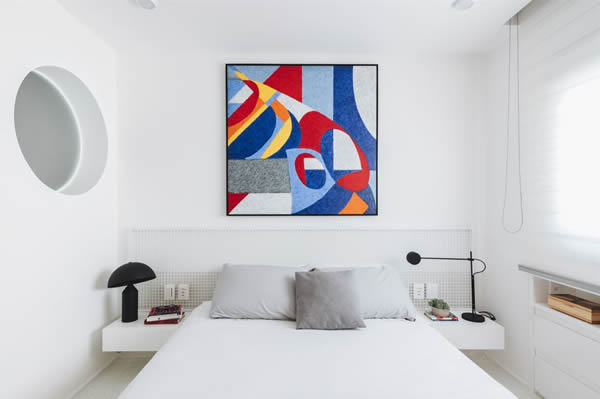 A suíte desse apartamento é composta por tons claros com a intenção de destacar a obra de arte em cima da cabeceira em serralheria, que não encosta no piso e sobrepõe o granilite da cabeceira | Projeto Rawi Arquitetura + Design | Foto: Juliana Deeke