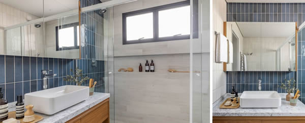Revestimentos neutros e azuis são destaque no banheiro da suíte | Projeto Atelier Paulo Tripoloni | Foto: Rafael Renzo | Produção: Mayra Navarro