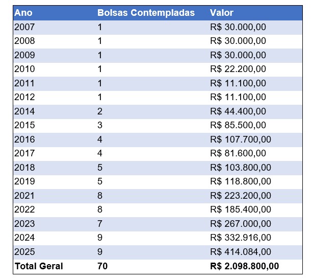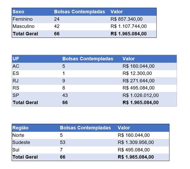 - Embora a maior concentração de beneficiários esteja na região Sudeste, com 53 bolsas que representam um aporte de R$ 1,3 milhão, sendo o estado de São Paulo o principal polo, com 43 bolsas, o programa também alcança outras regiões, com sete bolsas no Sul (R$ 495 mil) e cinco bolsas no Acre, na região Norte, somando R$ 160 mil.