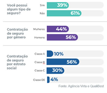 A pesquisa abordou também a penetração atual dos seguros no Brasil, mostrando que 39% dos respondentes possuem algum tipo de cobertura. Entre eles, 44% são mulheres e 56% são homens, sendo 10% da classe A, 56% da B, 30% da C e 4% da DE.