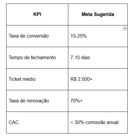 - Tempo médio de fechamento mostra a eficiência do processo comercial. Se um corretor leva 30 dias para fechar e outro leva 10, há uma oportunidade clara de melhoria.