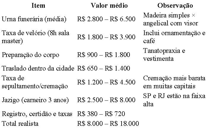 A verdade nua e crua é que morrer ficou caro no Brasil. O custo médio de um funeral completo (velório + traslado + sepultamento/cremação + taxas de cemitério) varia entre R$ 6.000 em cidades pequenas e R$ 18.000 nas capitais, segundo levantamento atualizado de funerárias e seguradoras.