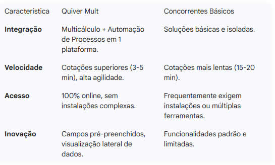 O Quiver Mult reduz o tempo de cotação de 15-20 minutos para 3-5 minutos com precisão total. Isso é possível graças a inovações como: