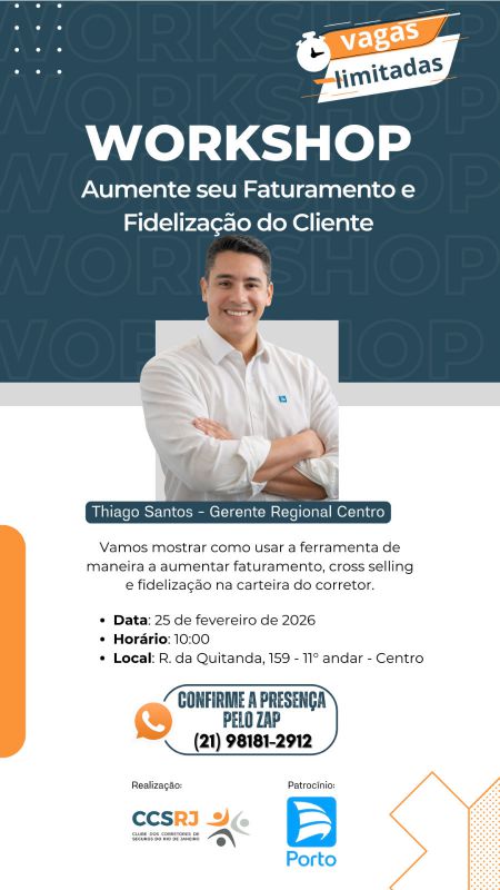 O Clube dos Corretores do Rio de Janeiro (CCS-RJ) receberá em sua sede, no Centro do Rio, na manhã da próxima quarta, dia 25 de fevereiro, a Porto para um Workshop sobre Aumento de Faturamento e Fidelização de Clientes.