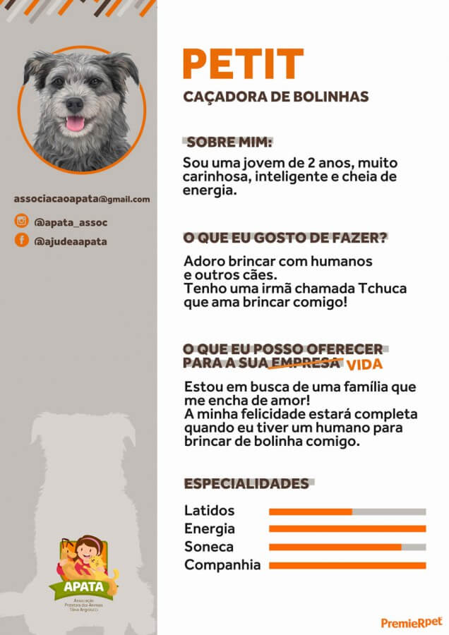 É o caso da Petit, uma cadela resgatada pela ONG APATA. Seu currículo está caprichado no LinkedIn da PremieRpet® e revela: é carinhosa, inteligente, cheia de energia e está preparada para conquistar uma família cheia de amor!