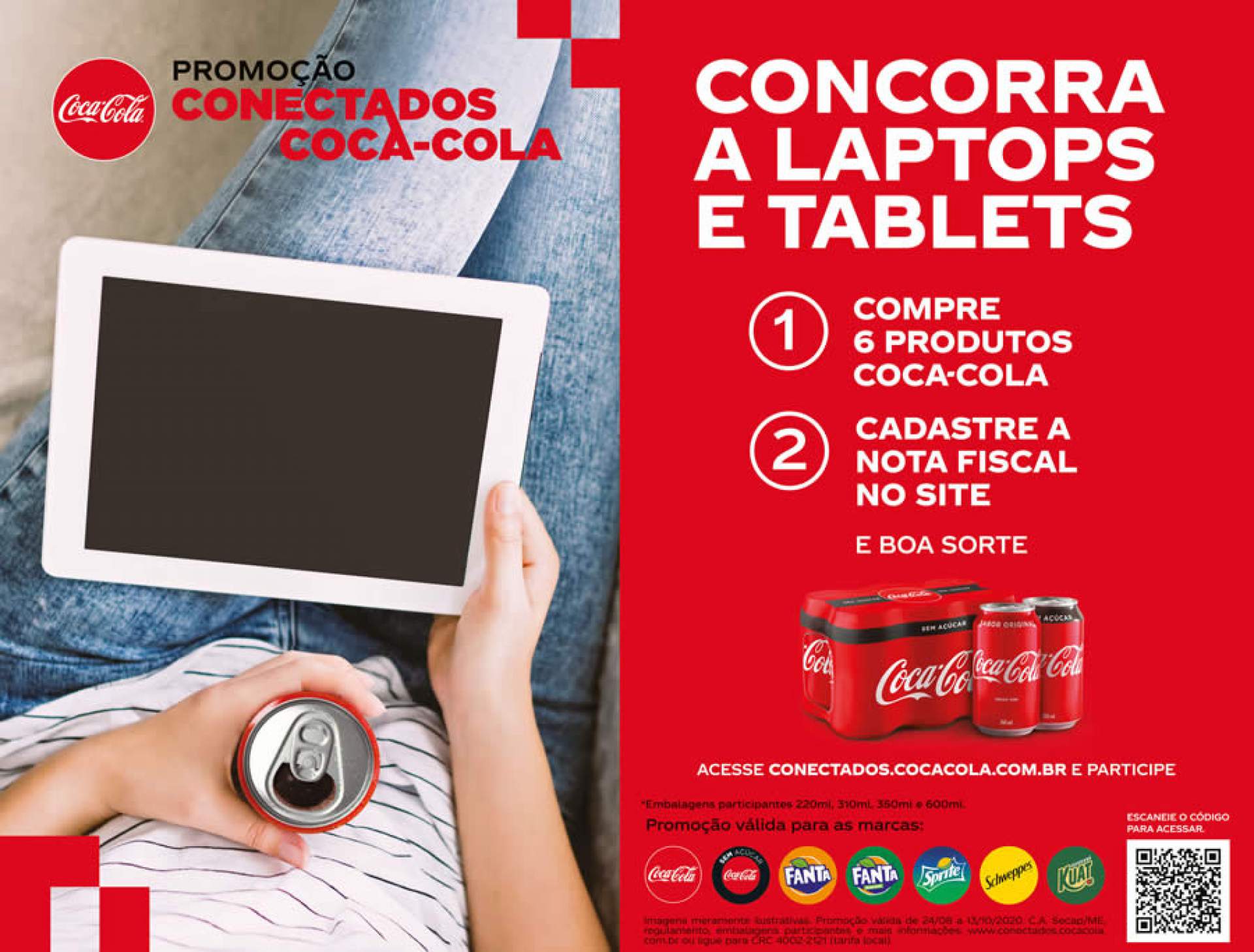 Para participar, basta comprar seis ou mais unidades dos produtos participantes (na mesma nota fiscal) nos pontos de venda oficiais da marca (minimercados, supermercados e hipermercados, além de atacados e atacarejos) e cadastrar a nota no site da promoção (www.conectados.cocacola.com.br), em que será gerado um número da sorte. Serão 840 prêmios, 140 laptops e 700 tablets, sorteados semanalmente via Lotomania. Todo o portfólio de refrigerantes da companhia em suas apresentações de latas (310/350/220ml), PET (600ml) e vidro (250ml) participa da promoção.
