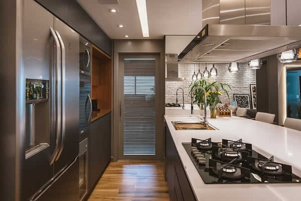 Junto com a decisão pelo cinza, o acabamento da marcenaria é outro ponto relevante a ser considerado, haja vista deve ser resistente e prático para a rotina de uma cozinha. Dessa forma, o cinza pode marcar presença em laminados, painéis de BP, melamínicos, laca ou MDF revestido em tons mais escuros (grafite) ou claro (cristal) – muito indicados para cozinhas em função de sua solidez. “Para quem deseja destacar o armário com uma base cinza, a laca brilhante se configura como uma excelente opção. O acabamento propicia fácil limpeza e visualmente chama bastante atenção, dando um ar ainda mais primoroso ao cômodo”, explica a arquiteta Carina.