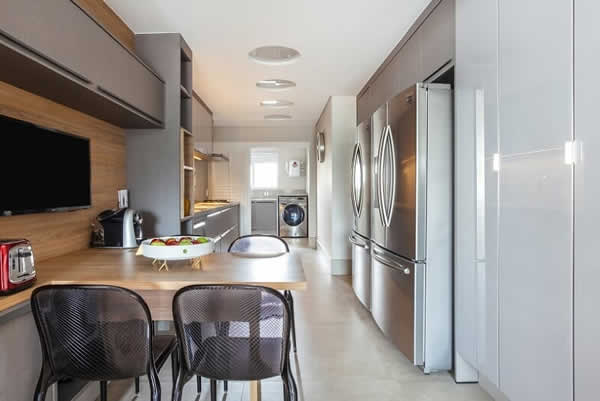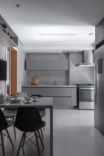 Neste projeto assinado pelo escritório Dantas & Passos Arquitetura, o aspecto monocromático é quebrado com o amadeirado que reveste o painel da TV e a mesa para refeições rápidas. Nas demais escolhas da cozinha, o cinza segue presente nos eletrodomésticos e no porcelanato que simula o efeito de cimento queimado no piso | Foto: Maura Mello