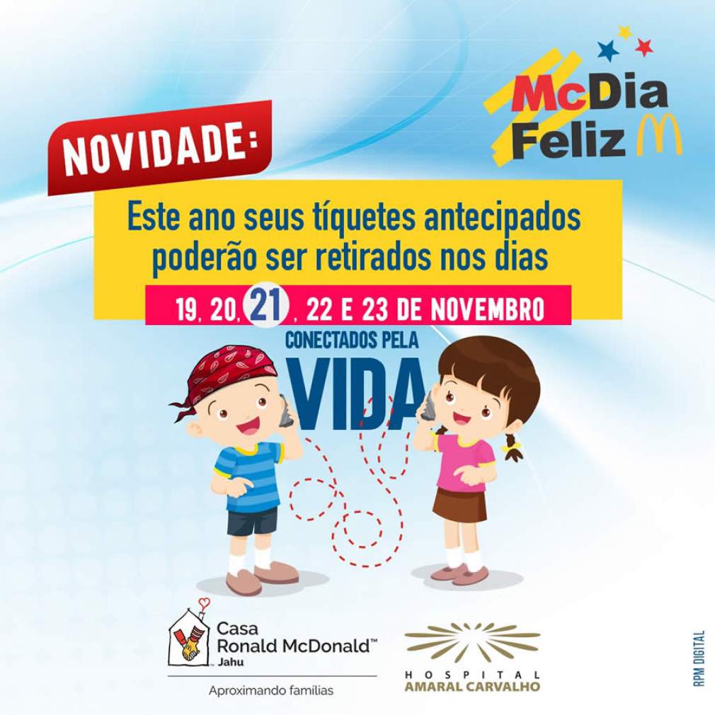 Sábado (21/nov) é o McDia Feliz, a maior mobilização nacional pela luta contra o câncer infantojuvenil. A arrecadação em oito cidades da região será destinada à Casa Ronald McDonald Jahu (CRMJ), que acolhe crianças e adolescentes em tratamento de câncer no Hospital Amaral Carvalho (HAC).