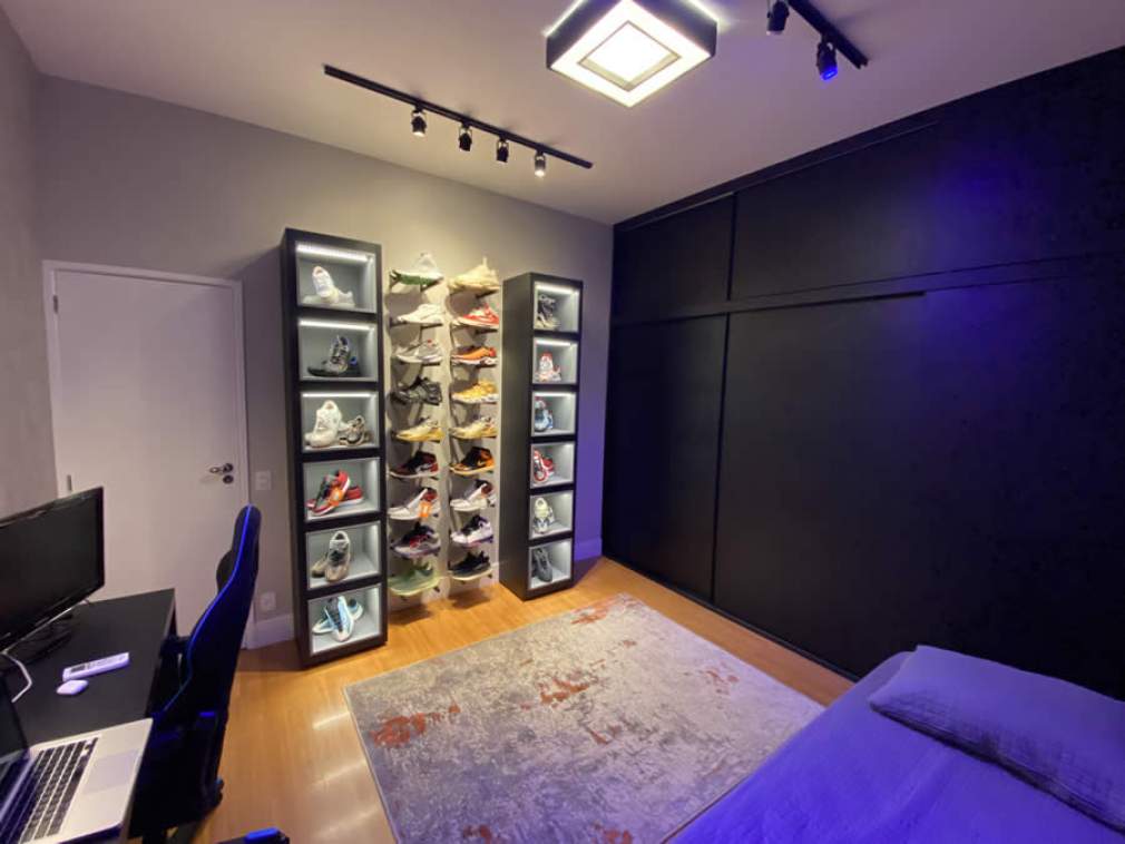 Tivemos, recentemente, o caso de um cliente que usa tênis raros e escassos. Ele tinha um quarto de adolescente, e como ele está se profissionalizando na área (produtor de conteúdo/ lives commerce) nos chamou para desenvolver o quarto e assim conseguir expor os produtos dele de maneira mais eficiente.