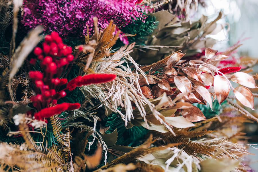 Loja também apresenta a mistura de decoração misturando árvores e flores naturais com flores desidratadas