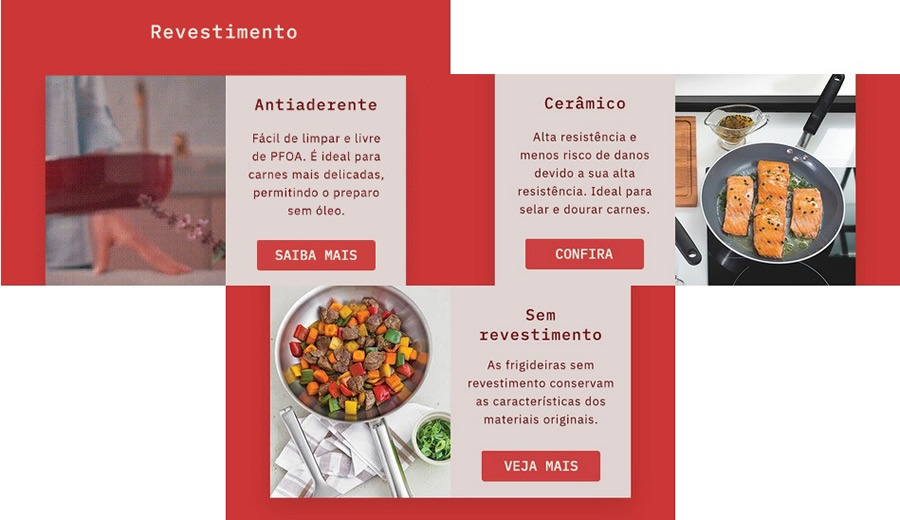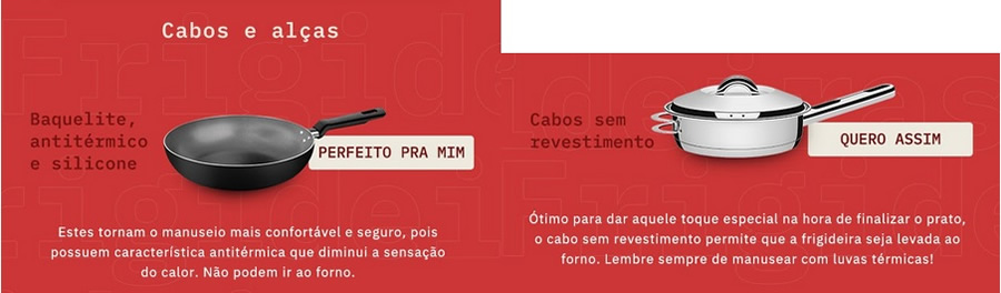 Cabos sem revestimento: ótimo para dar aquele toque especial na hora de finalizar o prato, o cabo sem revestimento permite que a frigideira seja levada ao forno. Lembre sempre de manusear com luvas térmicas.