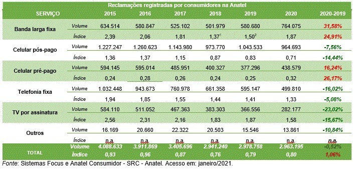 Anatel divulga balanço de reclamações em 2020