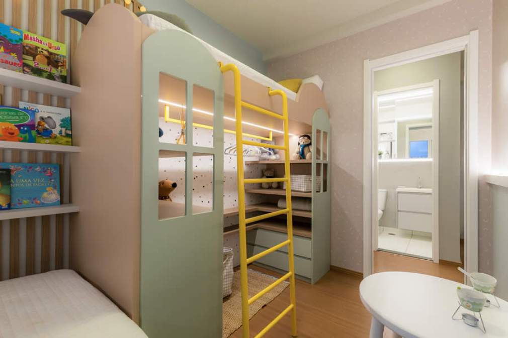 Já nos quartos, a arquiteta salienta que preferiu obter mais funções ao espaço, que vão além de um dormitório. “No quarto infantil, criamos um ambiente lúdico e relaxante, onde as crianças podem brincar, descansar e estudar”. A utilização de uma beliche não convencional possibilitou a colocação de um closet menor, bem como gavetas para roupas e prateleiras para brinquedos embaixo de uma das camas. Um simples cordão de luz de led deu ainda mais charme para o cômodo. “Essas são ideias que podem ser ampliadas ou adaptadas de acordo com a necessidade do morador”, detalha Cristina.
