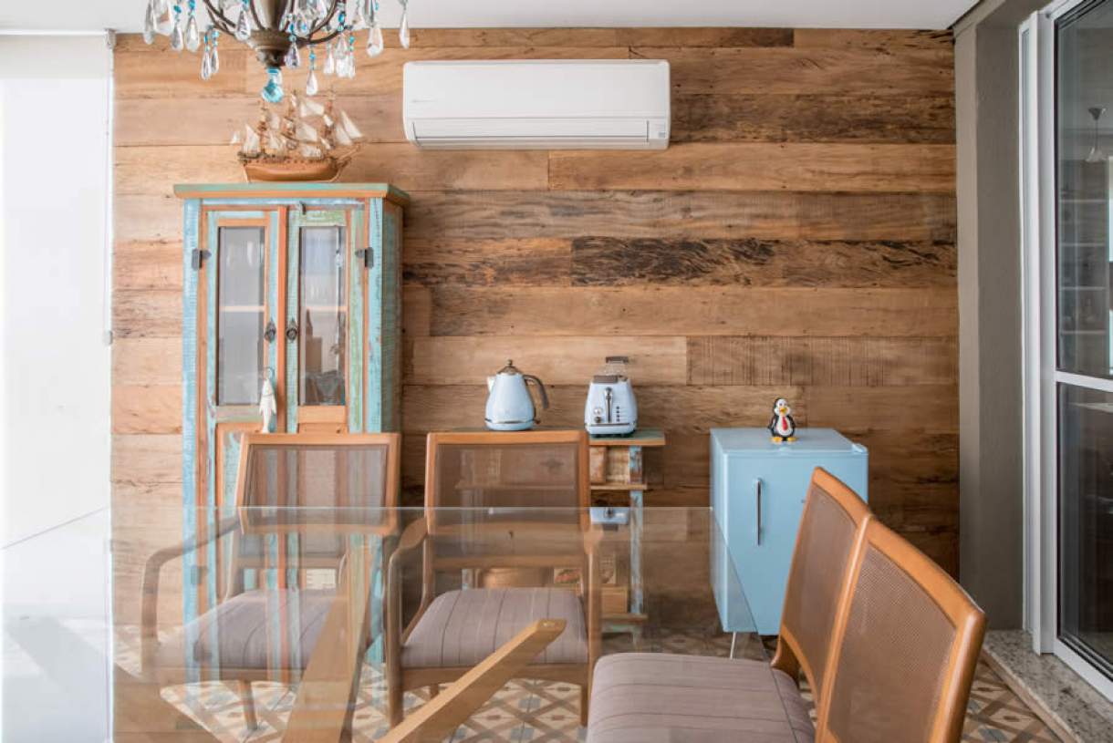 A madeira de demolição também pode estar presente nos móveis, com os traços que nos conectam ao décor de outrora. Na varanda, a arquiteta Isabella Nalon promoveu essa combinação com a material presente na parede da varanda | Foto: Julia Herman