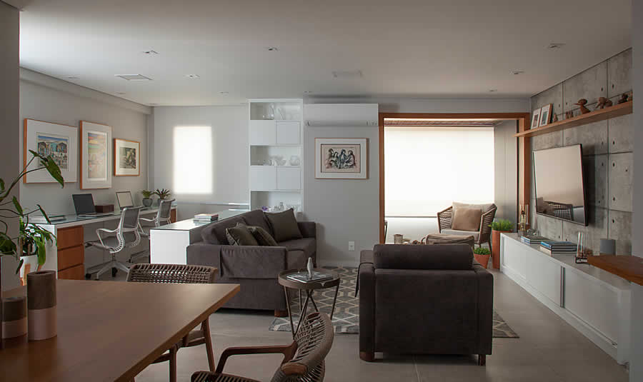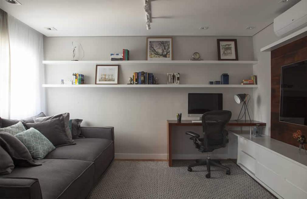 Na sala de estar integrada, de um lado há uma área de home office e, do outro, a sala de TV. Com um projeto bem elaborado, nada de cabos à vista ou canaletas percorrendo os cantinhos da parede| Projeto Bruno Moraes e foto de Luis Gomes