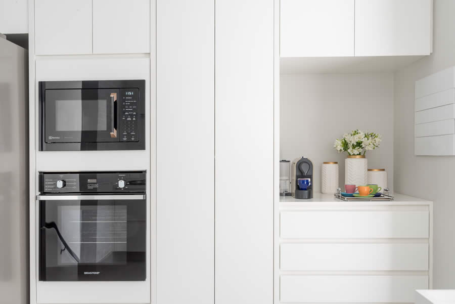 No mobiliário da SCA Jardim Europa, a arquiteta Carina Dal Fabbro previu um nicho para a cafeteira, além de gavetas onde os moradores guardam vários itens | Fotos: Rafael Renzo