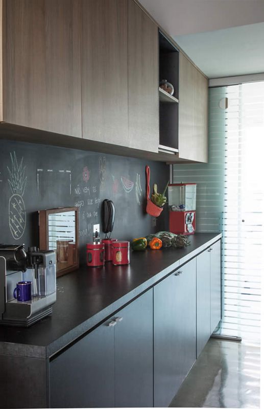 Neste projeto do Blaia e Moura Arquitetos, a bancada da cozinha serviu de apoio tanto para a cafeteiras e as xícaras, como a bandeja que funciona como bar | Foto: JP Image