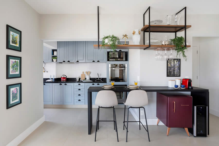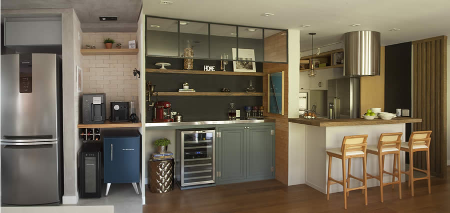 Apartamentos reformados pelo arquiteto Bruno Moraes com cantinho do café e bar conectado à cozinha | Fotos: Luis Gomes