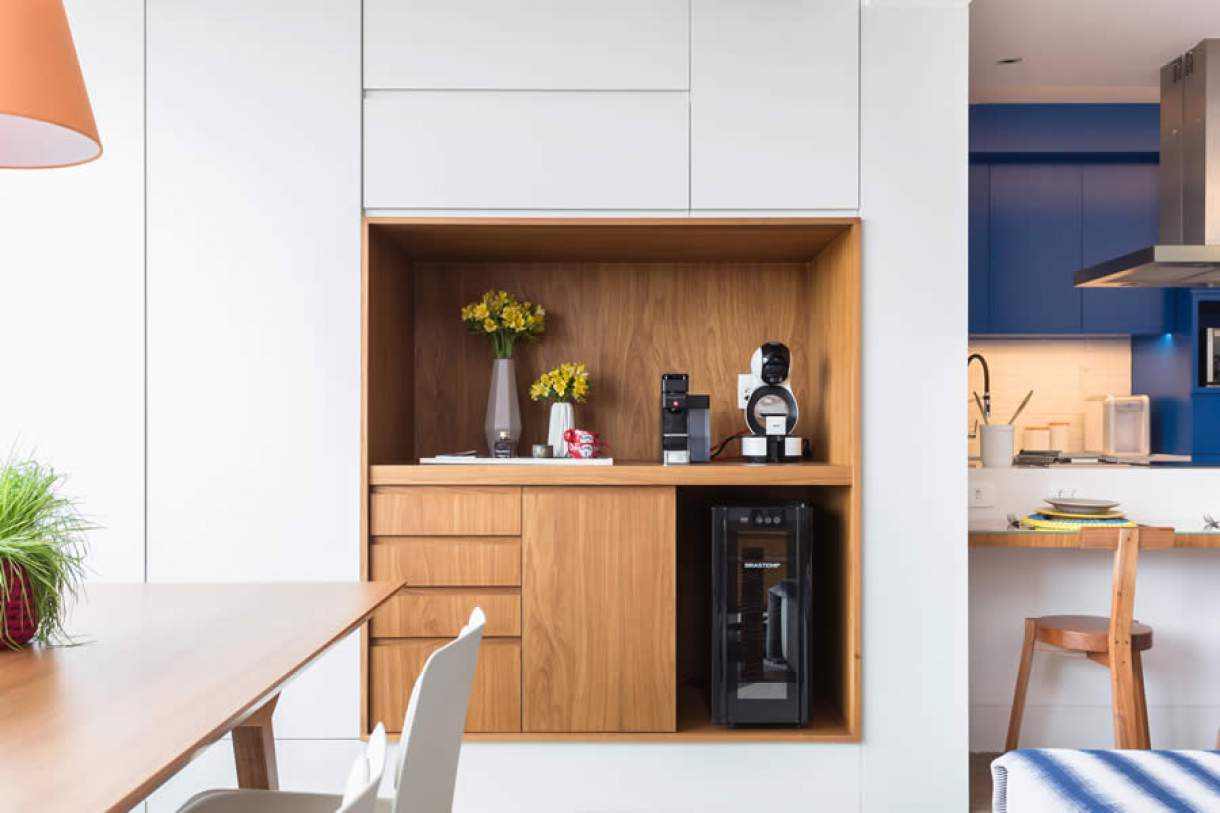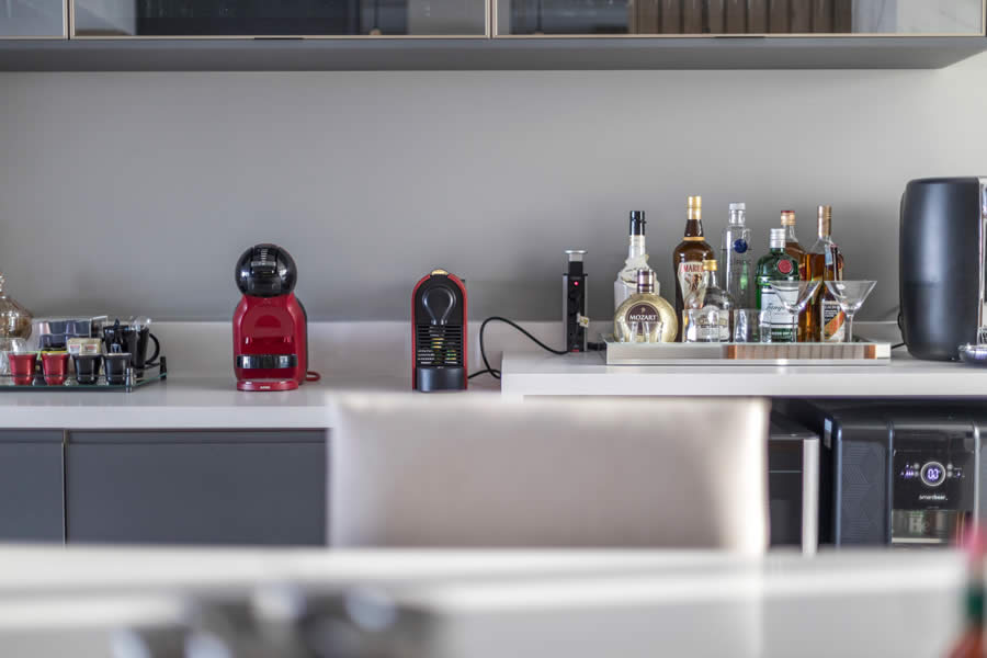 Para deixar a bebida mais perto da sala de jantar e cozinha, as profissionais da Meet Arquitetura aproveitaram o armário da área social para expor a cafeteira | Foto: Photons Fotografia