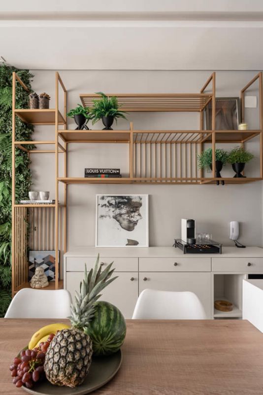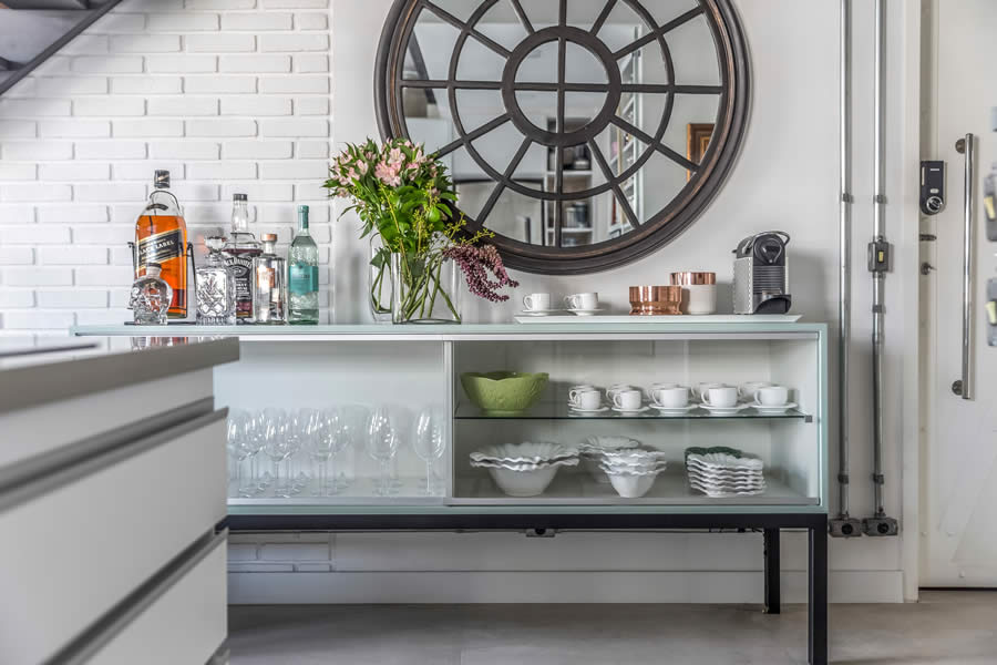 - Podemos usar um móvel sob medida ou um carrinho-bar. “Outra situação comum é dispor uma bandeja grande sobre o frigobar para organizar a cafeteira e os acessórios. Ainda é possível adicionar prateleiras ou um móvel com gavetas para guardar os itens usados no preparo”, sugere Pati.