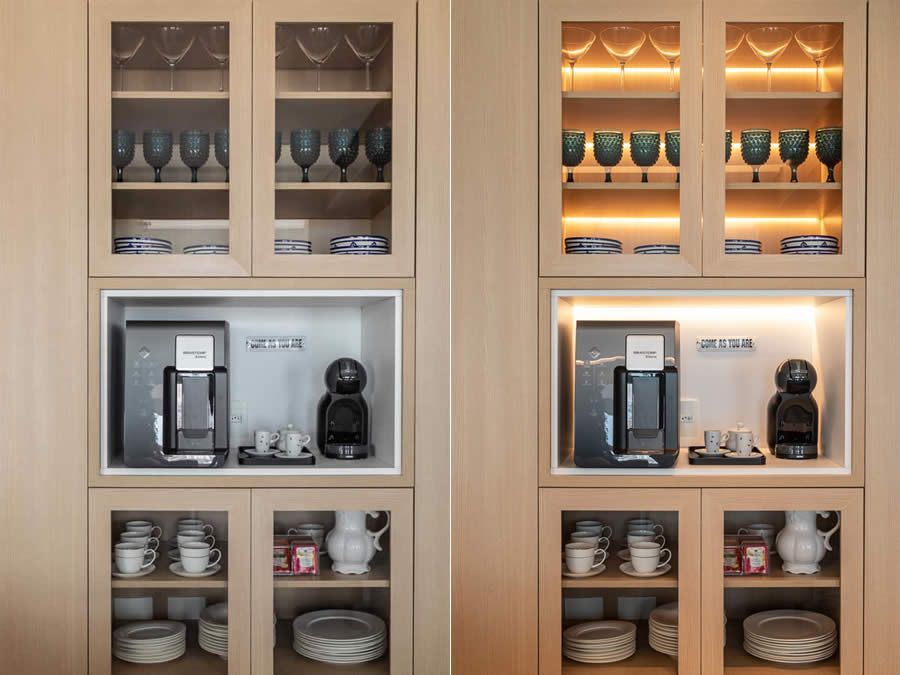 Há que prefira manter o cantinho do café dentro da cozinha, onde a marcenaria sob medida previu espaço para a bandeja com xícaras e a cafeteira. Outros acessórios também ajudam a compor o clima de degustação, como a fita de led, que foi embutida na parte superior do móvel ou o nicho de outra cor.