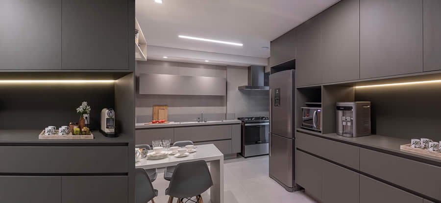 Nestes apartamentos, o cantinho do café ganhou um espaço especial integrado com a cozinha e sala de jantar. A cafeteira foi posicionada junto ao frigobar e adega, concentrando a área de bebidas da casa. Bancadas oferecem apoio para bandejas de xícaras e cafeteira, enquanto prateleiras e outras peças permitirem expor livros de culinária, quadrinhos e outros itens de decoração.