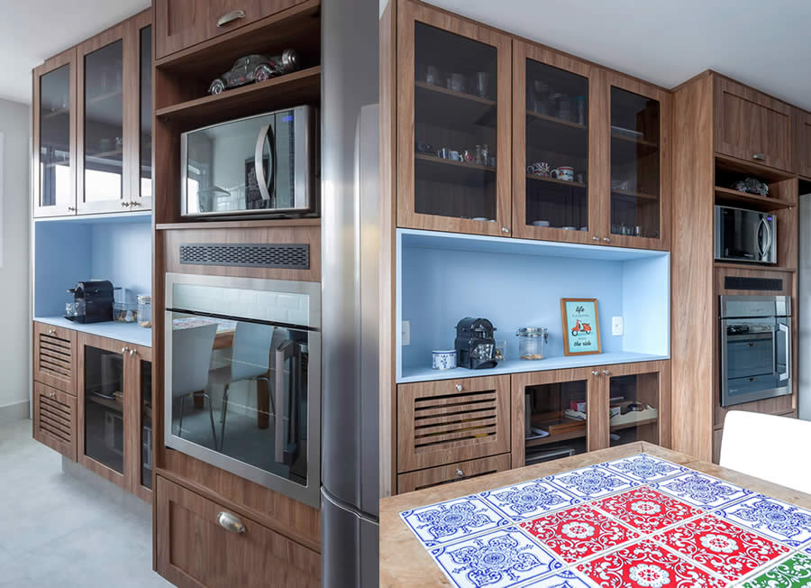 De laca azul, o nicho do café se diferencia do restante do mobiliário neste projeto assinado pela arquiteta Cristiane Schiavoni | Fotos: Carlos Piratininga