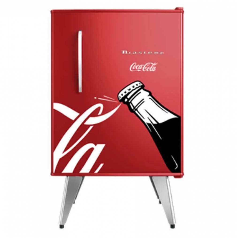 O Frigobar Brastemp Retrô Edição Limitada Coca-Cola tem 76 litros e resgata uma lembrança vintage com os pés-palito, o clássico logo "Brastemp" e o puxador, ambos originais da marca dos anos 50. Além disso, traz cores e acabamentos inspirados nas tendências mais atuais e conta com design exclusivo da marca Coca-Cola.