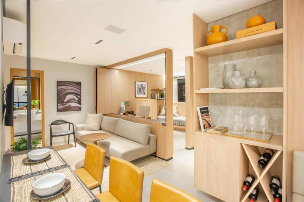 Outro projeto que resolveu adotar essa solução versátil foi a arquiteta Marina Neiva em seu projeto para o decorado do Maestro Residenza, empreendimento Innovar Construtora, WV Maldi e Joule Participações. Para o living do apartamento de 148 metros quadrados, ela apostou na integração com a cozinha, mas trouxe uma alternativa para se separar os espaços quando for conveniente para a família.