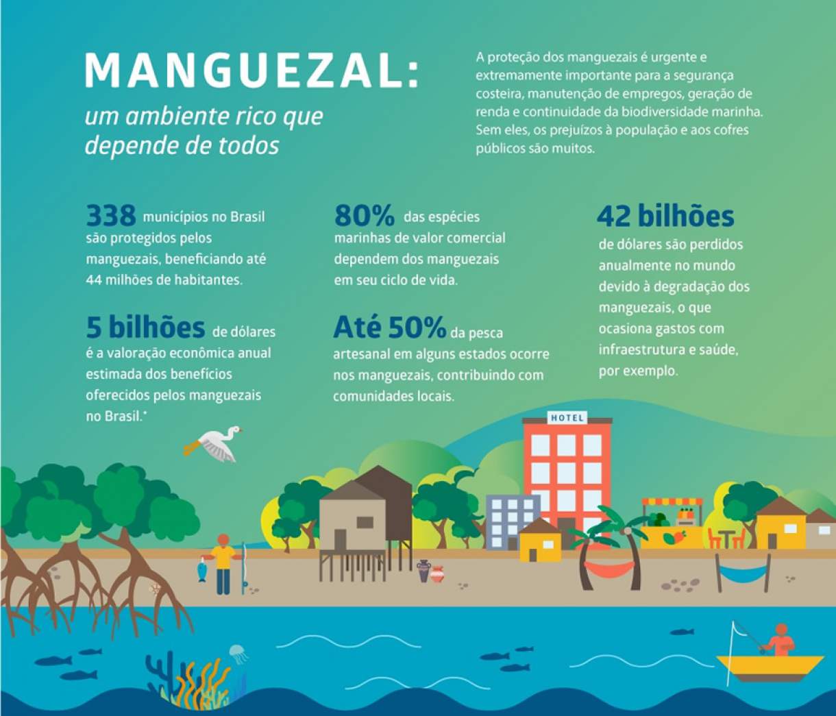 Além de oportunidades para a geração de renda, os manguezais são reconhecidos por sua contribuição para a manutenção da vida marinha, sendo o espaço apropriado para a reprodução e desenvolvimento de inúmeras espécies, e também pela proteção costeira, oferecendo segurança diante do aumento do nível do mar provocado pelas mudanças climáticas. Esse ecossistema é capaz de prevenir a erosão da costa, preservando a infraestrutura urbana, e proteger as regiões costeiras contra a força das marés e dos ventos fortes vindos do mar, além do elevado potencial para a retenção de carbono em suas raízes.