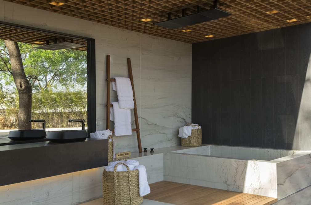 O ambiente une conforto e versatilidade, com o uso do porcelanato no piso, nas paredes, bancadas e no imponente pórtico que se destaca na entrada. Contrapondo a presença marcante da cerâmica, a paleta suave e neutra se mistura com a madeira, criando assim uma atmosfera leve e aconchegante. A intenção é fazer o visitante se sentir em casa.