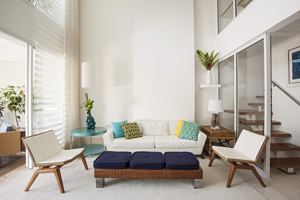 Nesse projeto, os profissionais do Korman Arquitetos optaram por um tecido neutro no sofá, deixando as cores para as poltronas. Foto: Gui Morelli