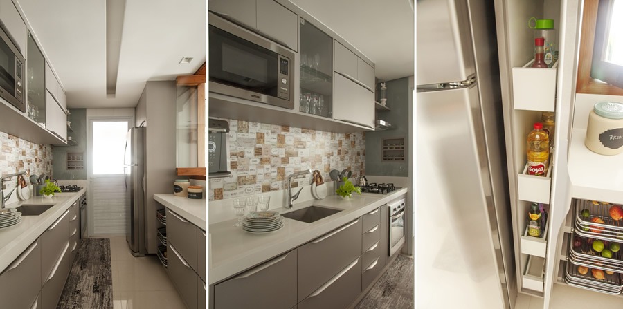 Disposta de forma linear, essa cozinha compacta projetada por Bianca Tedesco e Viviane Sakumoto conta com diversas soluções inteligentes para aproveitar o espaço - como a dispensa vertical, ao lado da geladeira, e o gaveteiro para frutas, que permite que a bancada fique mais livre. Foto: Luís Gomes