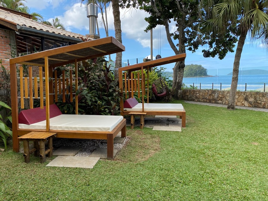 Para criar um cantinho perfeito, Cezar Scarpato indica sempre o uso de espreguiçadeiras, seja para tomar sol ou relaxar sob a sombra. "Ombrelones também são indispensáveis, para a proteção de sol, chuva e garoa sobre mesas e espreguiçadeiras", diz. Os modelos articulados, com pés centrais e laterais, são os mais indicados. Mesinhas laterais próximas das espreguiçadeiras são perfeitas para apoio de drinks, livros, óculos e protetor solar, ao passo que mesas maiores e cadeiras com braço podem criar um cantinho para refeições. "Nesses ambientes, é indicado pensar no uso de gazebos fixos ou retráteis, criando um espaço coberto e aconchegante", afirma Scarpato. Além da área gourmet, ele pode abrigar um espaço de estar com sofás, futtons e outras peças. "Destaque para sofás amplos de madeira ou fibra sintética em formato redondo, que tem ganhado força por todo o conforto que proporciona", indica o arquiteto e paisagista.