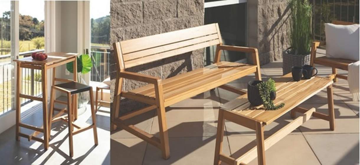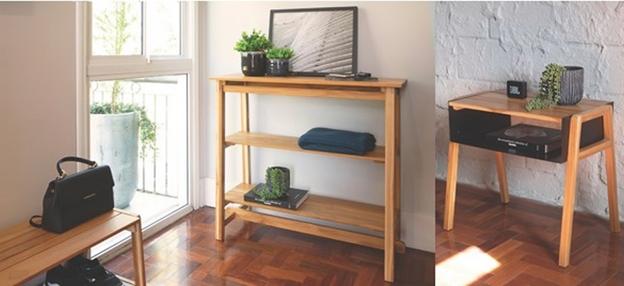 Os móveis são produzidos em madeira Teca de reflorestamento, com acabamento em verniz, e detalhes em aço e tecido. A linha completa conta com 13 diferentes produtos, como cadeiras, poltrona, mesas, estantes, bancos, banquetas, sapateira e mesa de apoio. Os itens são ideais para ambientes internos, como escritórios, salas de jantar/lazer e quarto, e para ambientes semiabertos, como pequenos lounges e varandas.