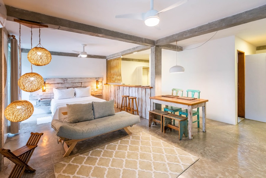 Como o exterior e espaços de lazer são os destaques de casas de praia, pensar em uma distribuição interna que valorize a conexão visual com o exterior é essencial. “A integração de ambientes é uma aliada, assim como um décor com menos excessos”, diz Scarpato. Cores claras, poucos mas interessantes objetos decorativos e móveis versáteis com tons naturais ajudam na composição mais clean, remetendo a leveza e amplitude da praia e do mar, e ajudam principalmente com a amplitude de ambientes pequenos.