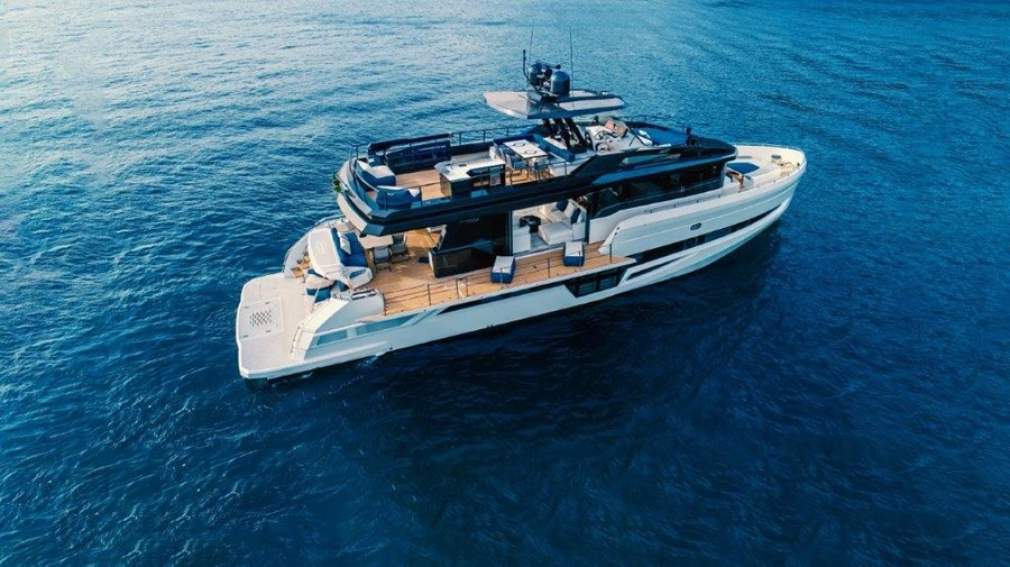 Ao todo, são 136m² de áreas externas ao ar livre, incluindo o flybridge (terceiro pavimento) que é um verdadeiro terraço sobre os mares. Esse ambiente é equipado com áreas de relaxamento, banhos de sol, bar e segundo posto de comando. Já na proa (parte frontal) está o lounge que pode ser usado como uma sala de estar privativa ao ar livre. Já a plataforma de popa merece atenção especial já que pode ser baixada, formando um Beach Club sobre as águas, ou ainda utilizada como garagem que comporta uma moto aquática e um bote inflável de apoio.