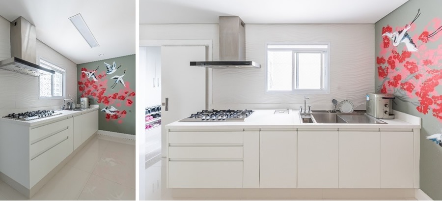 - Revestimento de parede: certos revestimentos de parede também são laváveis, como os papeis de parede vinílicos ou as tintas a prova d’água. “Mas é valioso reforçar que, quando falamos em revestimentos laváveis, não nos referimos ao uso de mangueira ou balde de água, mas sim um procedimento mais equilibrado com o uso de bucha ou um pano úmido”, complementa a arquiteta;