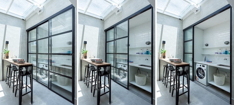 Nesse projeto executado por Cristiane Schiavoni, para solucionar a questão do espaço e organização dos itens de limpeza, a arquiteta optou por uma lavanderia embutida e integrada na cozinha. A porta de vidro e os seus diversos nichos da marcenaria contribuem para um ambiente mais prático. Com cada item em seu lugar, fica mais fácil encontrá-los rapidamente. | Foto: Carlos Piratininga