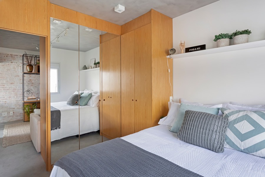 No dormitório de um apartamento pequeno realizado pelo escritório Oliva Arquitetura, a marcenaria protagonizou a distribuição dos armários, inclusive delimitando a divisão com a sala de estar, sem a necessidade de executar uma parede. Com um projeto super bem resolvido, os moradores desfrutam de aconchego e bem-estar com uma estética minimalista, que atende as necessidades do espaço | Foto: Júlia Ribeiro
