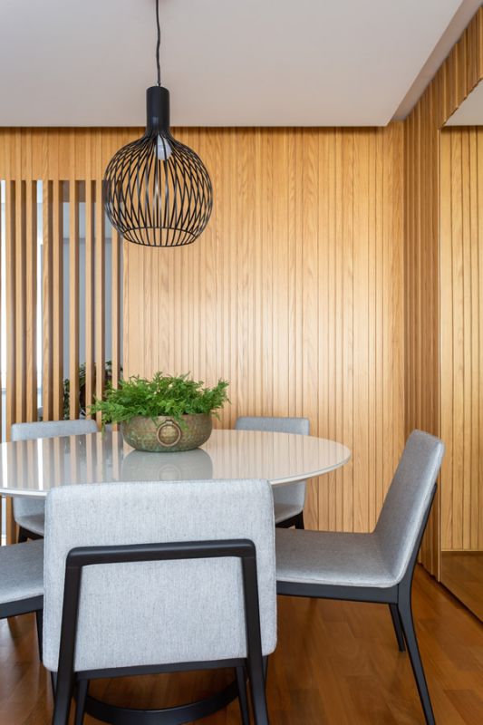 No projeto das arquitetas Claudia Yamada e Monike Lafuente, à frente do Studio Tan-gram, a marcenaria abraça o jantar e os brises revelam e, ao mesmo tempo, ocultam a cozinha. A mesa redonda deixa ocupa menos espaço e possibilita uma maior circulação l Foto: Estúdio São Paulo