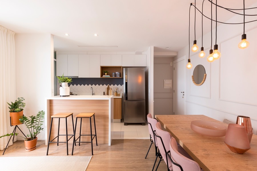 As arquitetas Eduarda e Nathalia relatam que apartamento menores com sala integrada e cozinha americana reúne um conceito propício para não incluir uma mesa de jantar. “Usar o balcão ou criar um outro nível nele com altura padrão de 75 cm pode ser uma maneira criativa para formar um local conveniente para as refeições, mesmo sem a mesa em si. Assim, eliminamos um móvel que ocuparia uma área significativa no cômodo”, relativiza Nathalia.