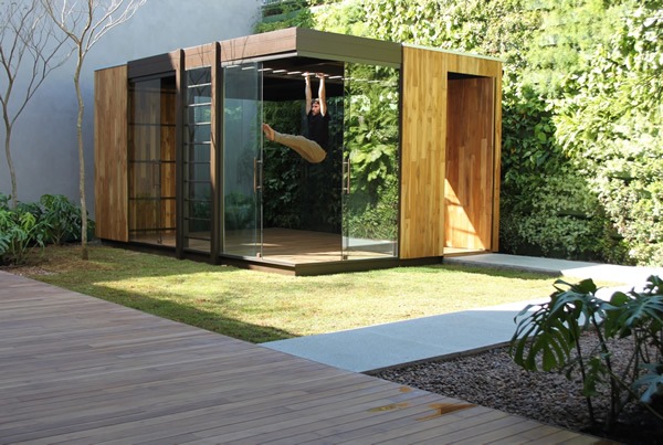 Nesse jardim projetado por Cezar Scarpato, com uma cabana que faz as vezes de sala de ginástica, a grama se tornou um convite para o exercício ao ar livre| Foto: Divulgação