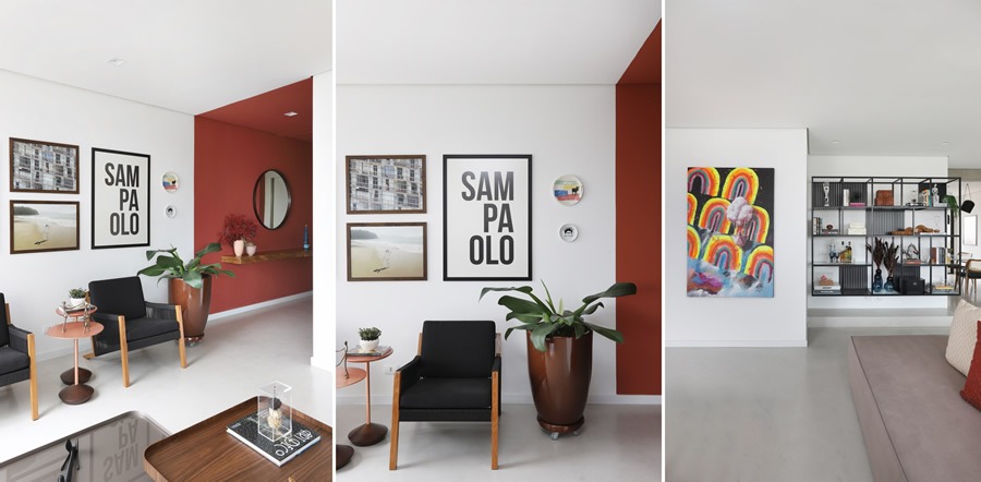 Para trazer jovialidade e mais vida para o imóvel, a dupla de arquitetas trabalhou bem com as cores – a começar pelo hall de entrada, que recebeu um convidativo tom de vermelho queimado. Esse mesmo tom pode ser visto em objetos decorativos, como nas almofadas, e foi combinado com uma poltrona verde e, claro, com obras de arte expressivas que sse espalham pelo estar. “Buscamos elementos para harmonizar e refletir o estilo e humor do casal. Combinamos diferentes cores, itens decorativos e um gallery wall para completar a parede e render boas fotos por ali”, afirmam Nathalia Lena e Eduarda Negretti.