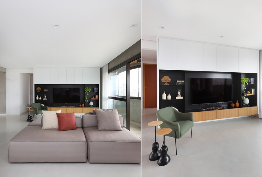 Como a ideia era prezar pela fluidez, sala de estar e home-theater são integrados, e um sofá-ilha surgiu como a escolha perfeita para atender aos dois ambientes. “Nesses espaços priorizamos móveis soltos, pois eles facilitam na hora da limpeza e possibilitam diferentes configurações de ambientes”, contam as profissionais do Lene Arquitetos. Um dos destaques fica para a estante de serralheria, desenhada pelas arquitetas especialmente para esse apartamento, reforçando a estética industrial. “Por ser toda vazada e suspensa, apesar de ser preta, traz leveza para o ambiente”.