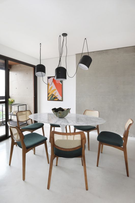 A sala de jantar se integra à cozinha e à varanda e conta com um mix de estilos no mobiliário. Foto: Mariana Orsi