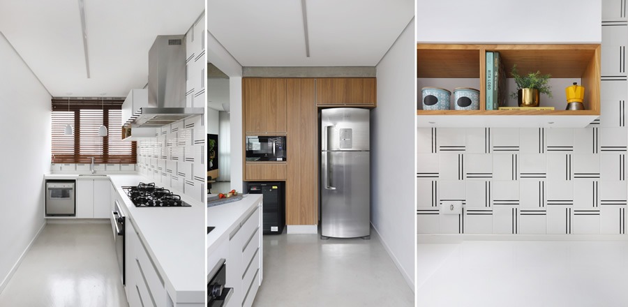 “A marcenaria planejada foi essencial para aproveitar cada cantinho da cozinha, que é estreita”, dizem Nathalia Lena e Eduarda Negretti. Toda de tons claros, tem como destaque o backsplash com revestimento geométrico, que traz graça para o ambiente.