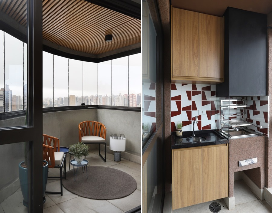 Apesar de pequena, a varanda contou com cantinho de estar e churrasqueria. Fotos: Mariana Orsi